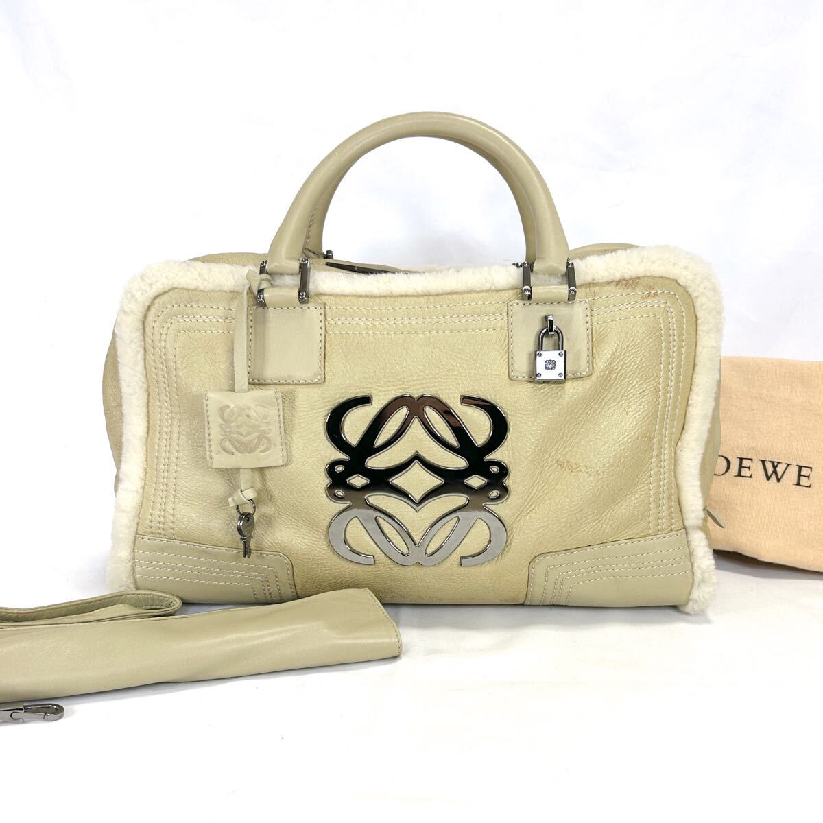 - ロエベ LOEWE アマソナ36 アナグラムビッグロゴ ボア ファー ミニボストンバッグ ハンドバッグ シルバー金具 レザー