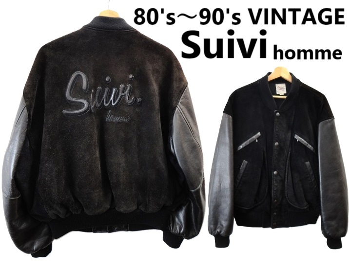 > 80's~90's ヴィンテージ/オンワード樫山/Suivi homme:スィヴィ オム/カウレザー ロゴ刺繍入り オールレザー スタジャン/ブルゾン/黒/L相当