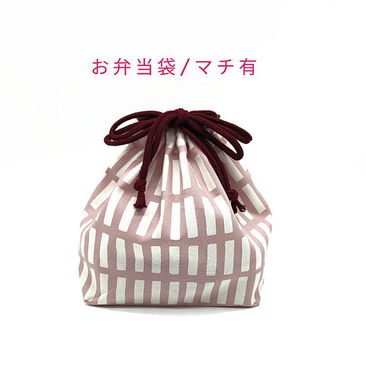 > お弁当袋・マチ有【北欧風 レクタングル柄 くすみピンク】ランチバッグ ランチ巾着 ランチ袋 弁当箱袋 お弁当入れ 大きめ 格子 ブロック