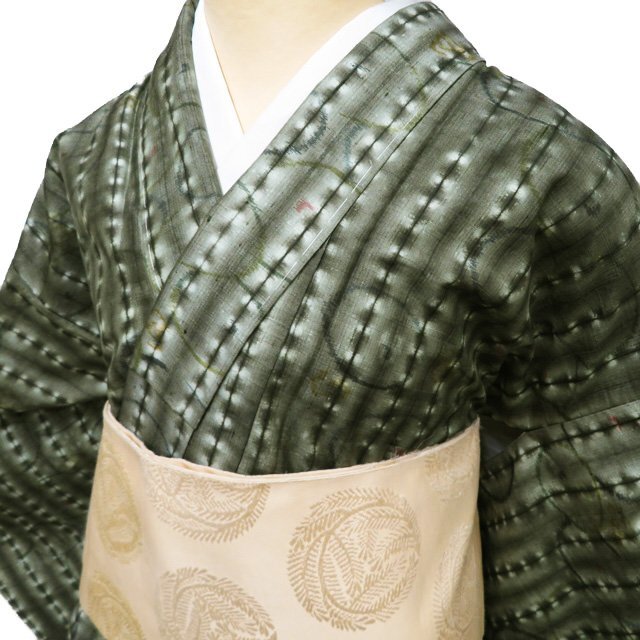 > 紬地 着物 未使用 正絹 袷 カジュアル 絞り染め 丸紋 反端付き 灰みの緑系色 多色 身丈156.5cm 裄62cm M きもの北條 A1141-1