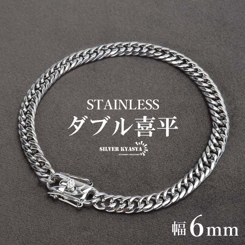 - ステンレス製 ダブル喜平ブレスレット シルバー 幅6mm マイアミチェーン 喜平チェーンブレスレット 細身 金アレ対応
