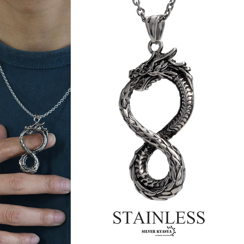- ドラゴンネックレス インフィニティ 龍 ペンダント シルバー 竜ネックレス メンズ 存在感 ごつい 伝説 神話 ステンレス素材