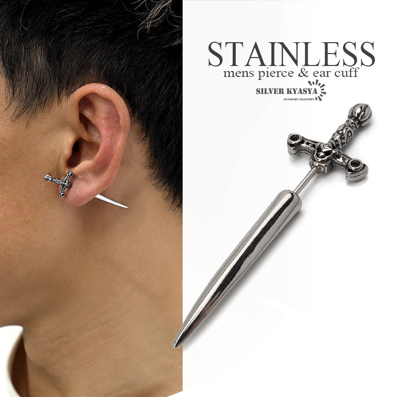 - ステンレス素材 ソードピアス 片耳 シルバー メンズピアス かっこいい 迫力感 存在感 剣ピアス