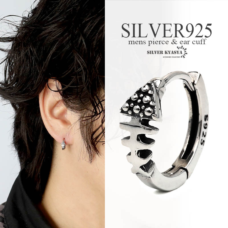 - シルバー925 フープピアス メンズ フィッシュボーン 魚 骨 スタッドピアス 銀 アニマル 金属アレルギー 片耳一点