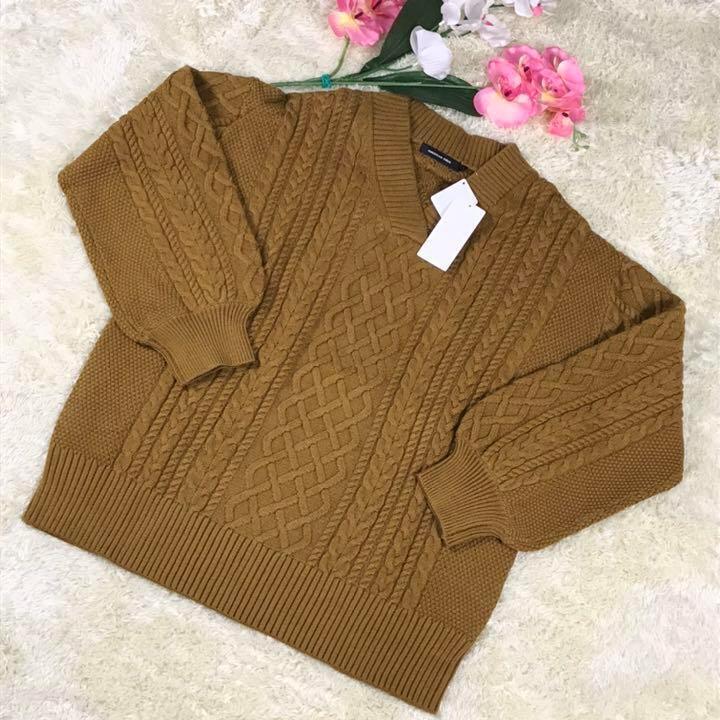 - 新品【Lサイズ・ブラウン】Vネック 袖ボリューム ケーブル ニット プルオーバー