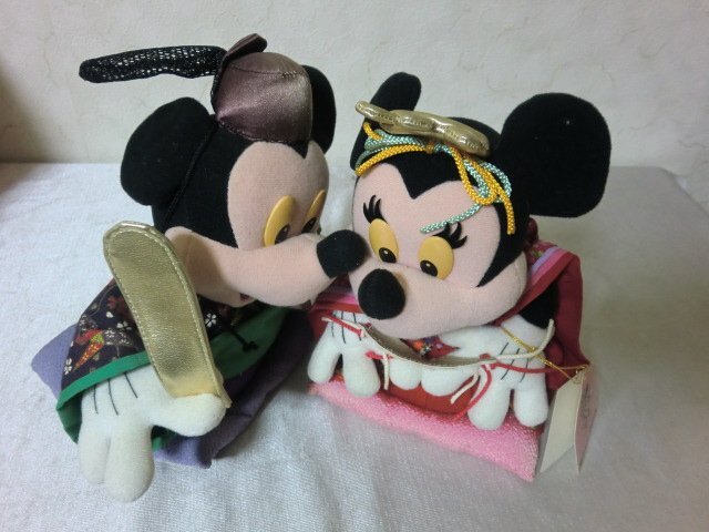 > (TANA)まとめて/ペア/ディズニー/ぬいぐるみ /ミッキー/ミニー/雛/ひな祭り/着物/2体/座布団/タグ付き/時期不明/和装/当時物/TDL/レア/希少