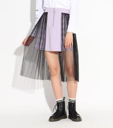 - ピンクラテ 女の子 サイドロングチュール切り替えスカート ウエストゴム パープル系/チェック スカート総丈38 ウエスト30~40 XS 150㌢