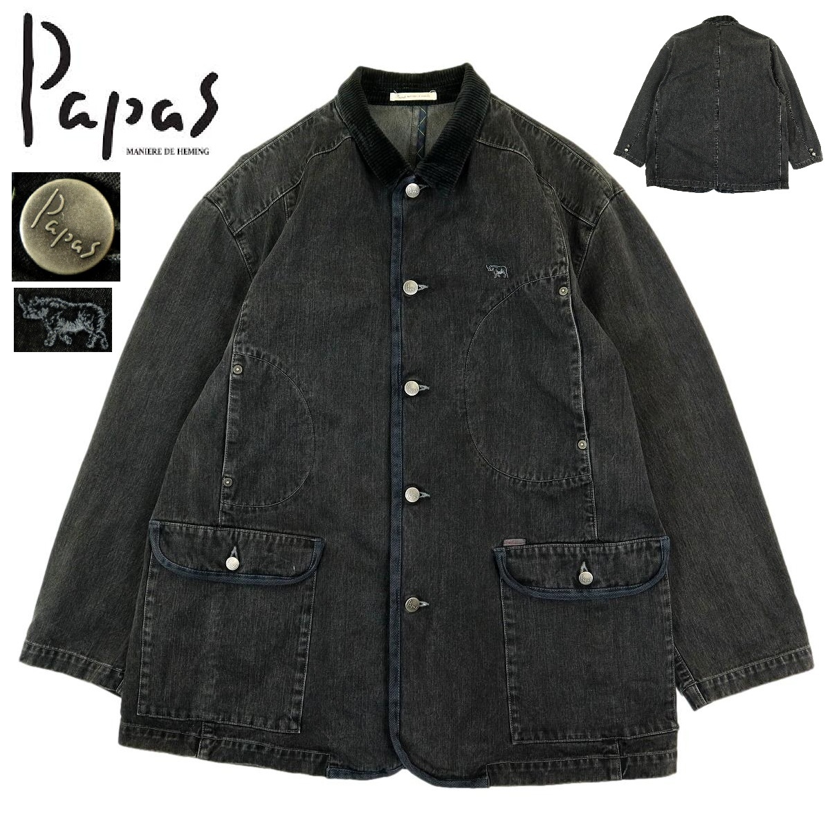- 【M394】Papas パパス カバーオール デニムジャケット ブラックデニム サイ刺繍 サイズS/46