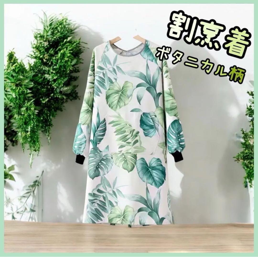 - 割烹着 ナチュラル リーフ柄 ボタニカル柄 おしゃれ 保育士 カフェ ガーデニング 帆布 ポケット グリーン