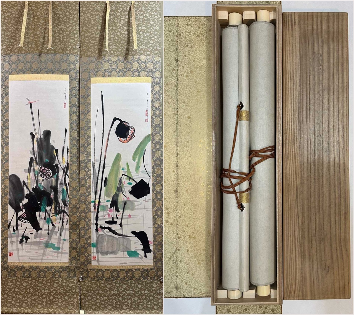 - 古美術 掛け軸 中国・近現代 「呉冠中書」 紙本 【彩荷図 対軸】 立軸 書道 巻き物 付木箱 肉筆保証 唐物 古画 画心37x112cm LT-250205