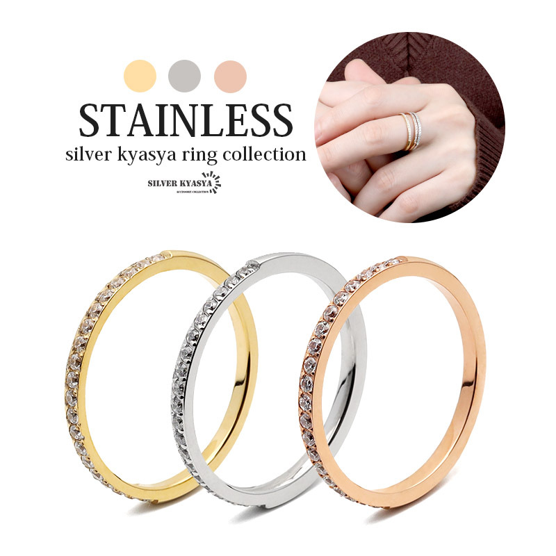 - (ゴールド、16号) ステンレス CZ エタニティ リング 細身 極細 ゴールド 金色 シルバー 銀色 ローズ ピンク
