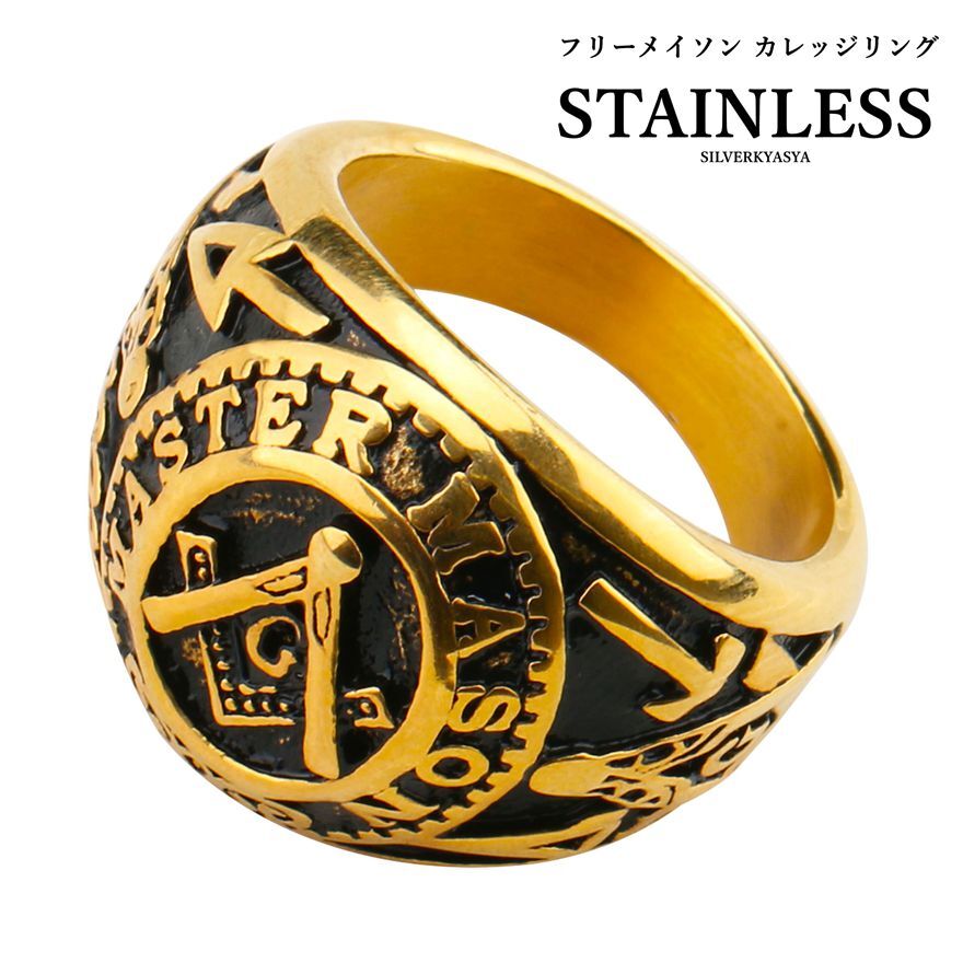 - (19号) ステンレス素材 フリーメイソンリング ゴールド カレッジリング 金 G リング 重厚感 演出
