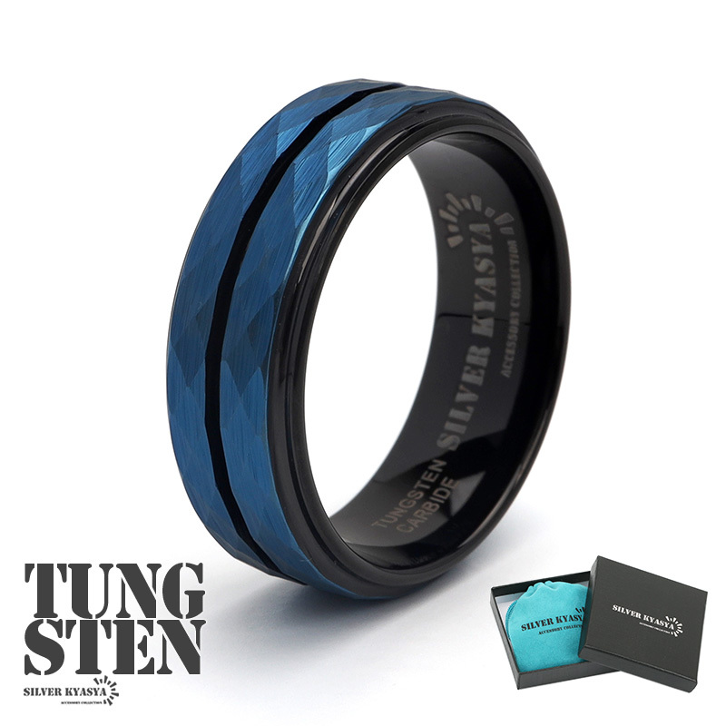 - (12号) タングステン ブラック ラインリング メンズ リング 指輪 ブルー ダイヤモンドカット つけっぱなしOK 専用BOX