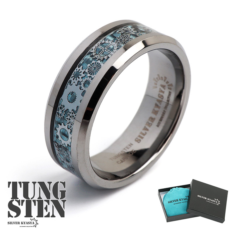 - (9号) タングステン 歯車リング 指輪 メンズ リング ブルー シルバー カーボン ギア 金属アレルギー対応 専用BOX付属