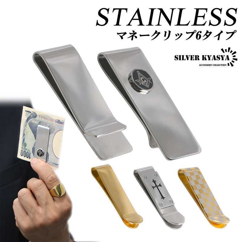 - (Dタイプ) ステンレス マネークリップ ウォレット 財布 携帯 お札入れ ゴールド シルバー 金色 銀色 クロス 十字架