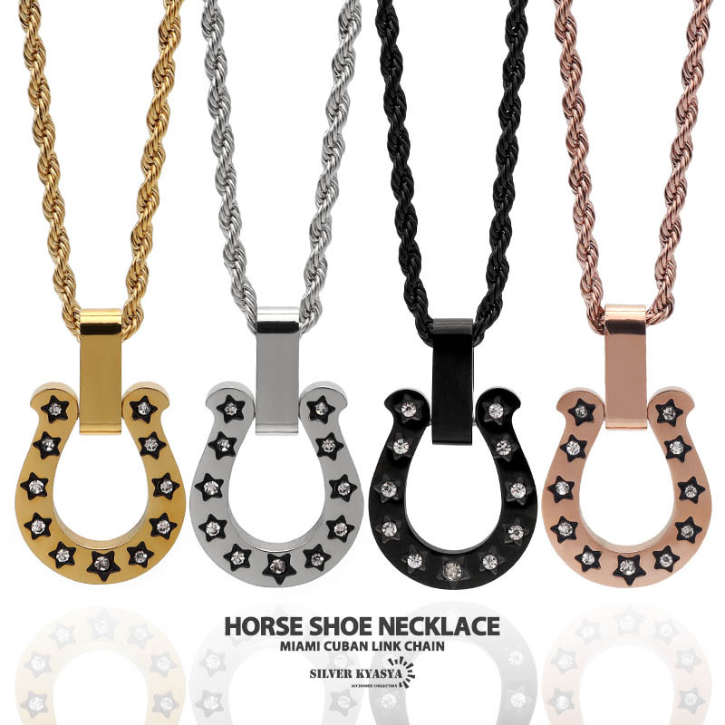 - (ブラック、45cm) 馬蹄ネックレス 316L サージカルステンレス ホースシュー 星 スター ストーン ロープチェーン