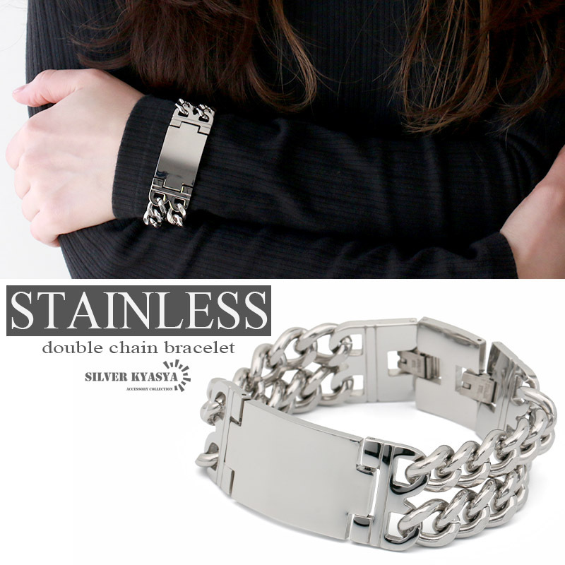 > (19.5cm) 2連 喜平チェーンブレスレット ダブル ブレスレット ステンレス バックル 大判 プレート 太幅 幅広 ワイド