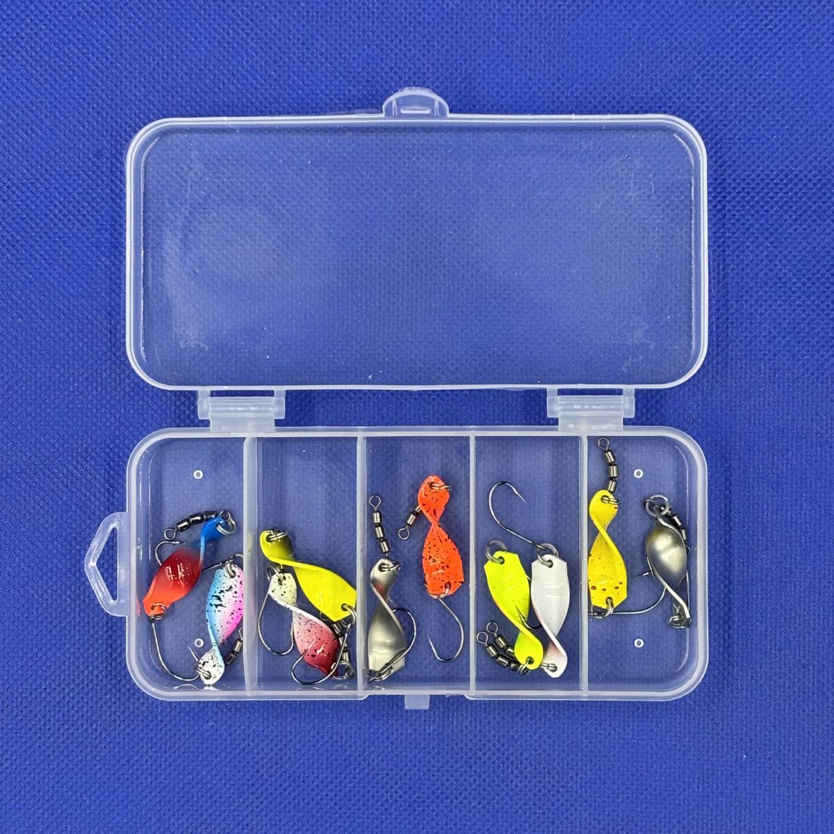 - 104248 ラインが絡まない 滑らかなローリング トリプルスイベル搭載 スパイラルスプーン 2.5g 10色セット ケース付き 管理池 渓流