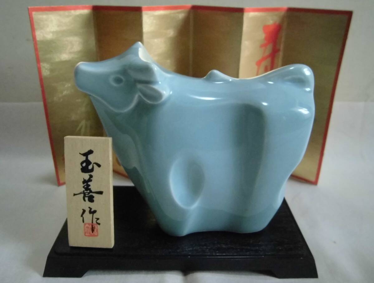 - 干支置物 丑 青磁 玉善作 飾り台 風付 牛 うし 陶人形 土人形 招福 開運 縁起物 飾り物 オブジェ 陶器 工芸品 レトロ
