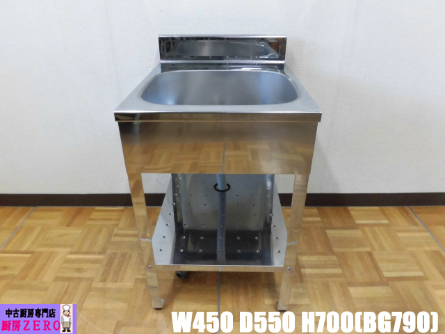 > 中古厨房 業務用 1槽シンク 流し台 ステンレス W450×D550×H700(BG790)mm 調整脚+20mm 深さ130mm バックガード付き 飲食店 店舗
