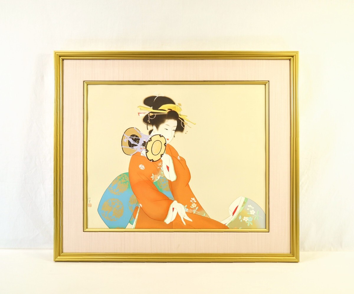 - 真作 上村松園 シルクスクリーン「鼓の音」画寸 60cm×49cm 上村淳之監修 円熟期のNY万博出品作 無心に鼓を打つ女性の凜とした表情 10363