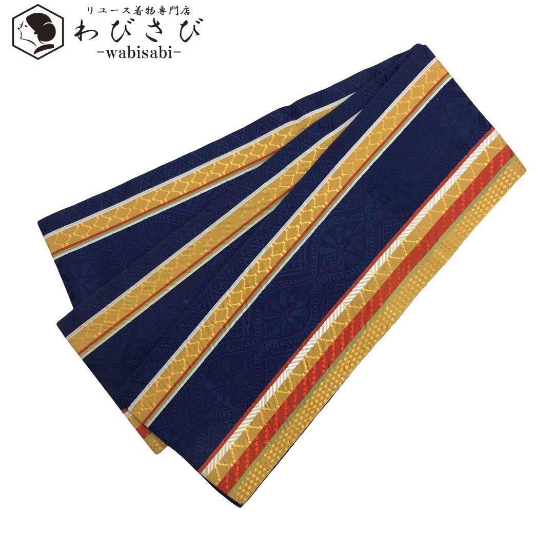 > 半幅帯 本場筑前博多織 証紙付 立涌に花模様 紺鉄色 D-2026 着物 きもの kimono 和服 和装 中古 リサイクル着物 【送料無料】