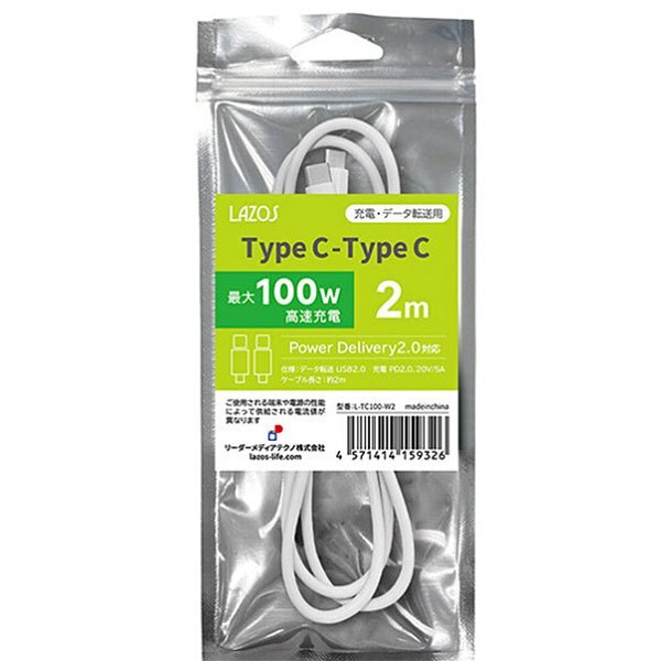 - Lazos TypeC-TypeC ケーブル 100W 2m ホワイト L-TC100-W2