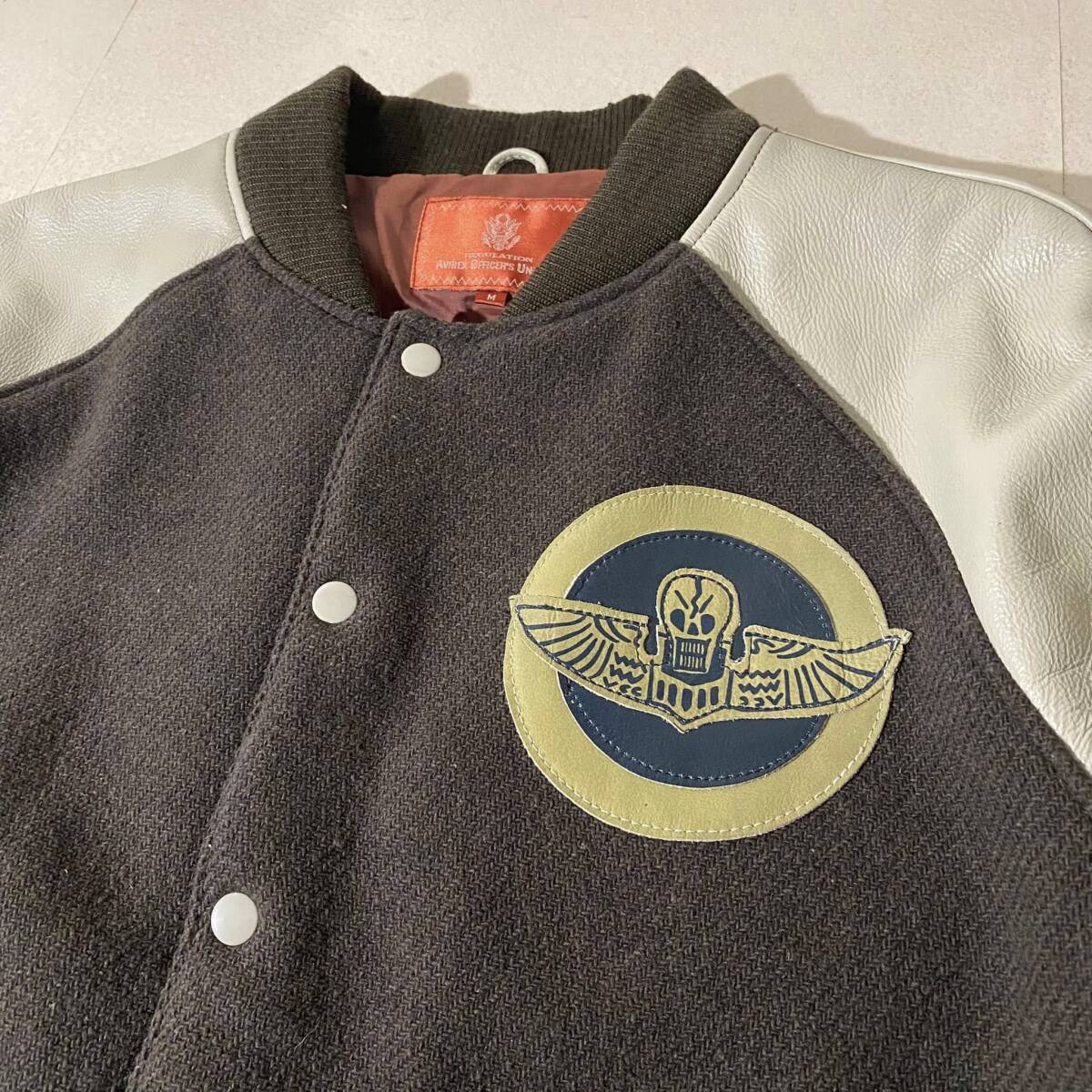 - 美品 AVIREX OFFICER'S UNIFORM アヴィレックス スタジャン スカルワッペン レザー袖 ラグランスリーブ パッチポケット【M】