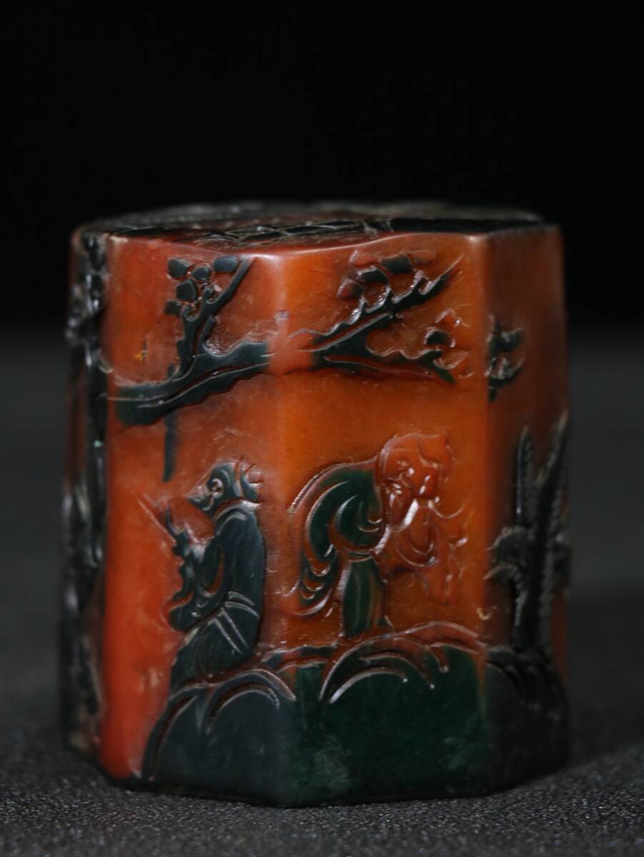 - 【超珍館蔵】寿山石 烏鴉皮 紅田黄石 細密彫 二老輪道紋印章 置物 古賞物 古美術品 稀少珍蔵品