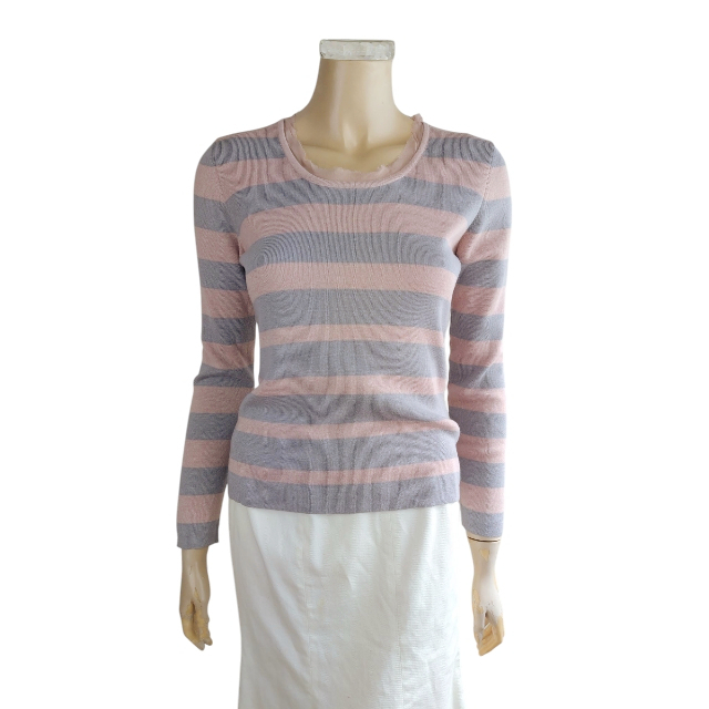 > 美品★Nap*Cara*絹(シルク混ウール*シルクシフォン*ボーダー柄*ドーンピンク系×フォグブルー系*しっとり長袖ニット*Lサイズ.40.11号