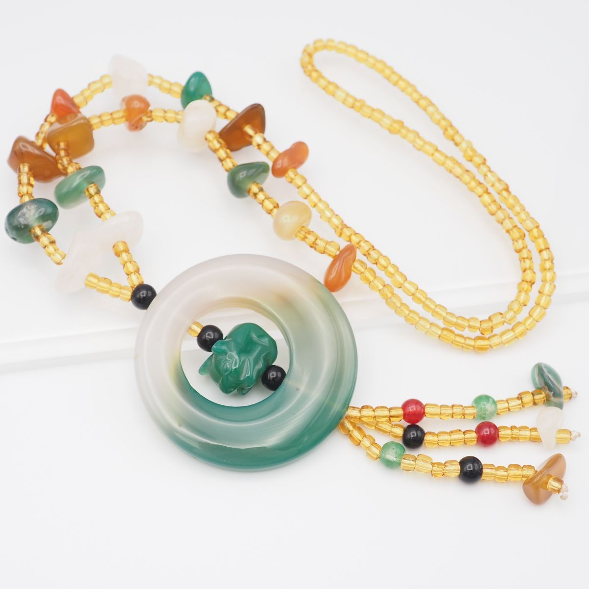 - H057 天然石 ネックレス 大ぶり ピッグ 豚彫刻 マルチカラー デザイン