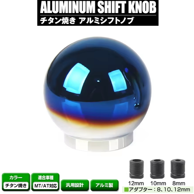 - アルミシフトノブ チタン風 A型 M8/M10/M12アダプター アルミ製 アルミ削り出し オートマ車 AT マニュアル車 MT どちらもok 球体シフトノブ
