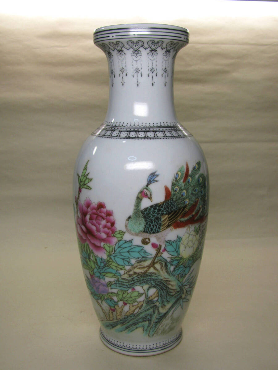 - [大幸] 景徳鎮制 孔雀画粉彩花瓶 良美品 中国美術 白磁 色絵 豆彩 古玩