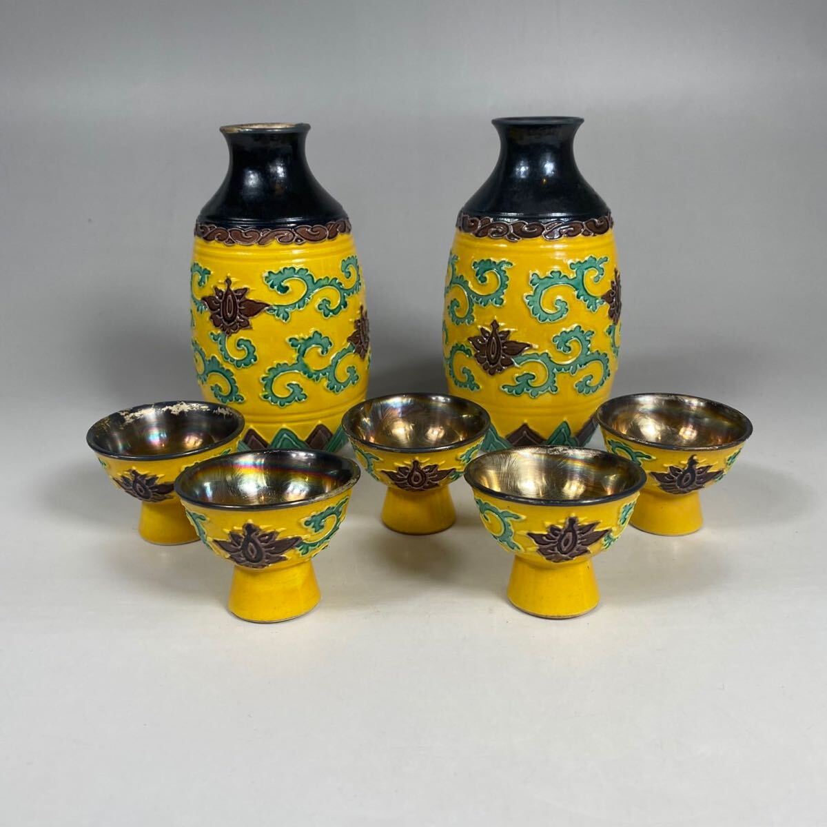 - 京菊 銀口黄交趾唐草紋徳利・銀張盃酒霽揃 七点★交趾焼 盃 茶道具 黄交趾 徳利 酒器セット 酒杯 酒盃 ぐい呑 盃 銀