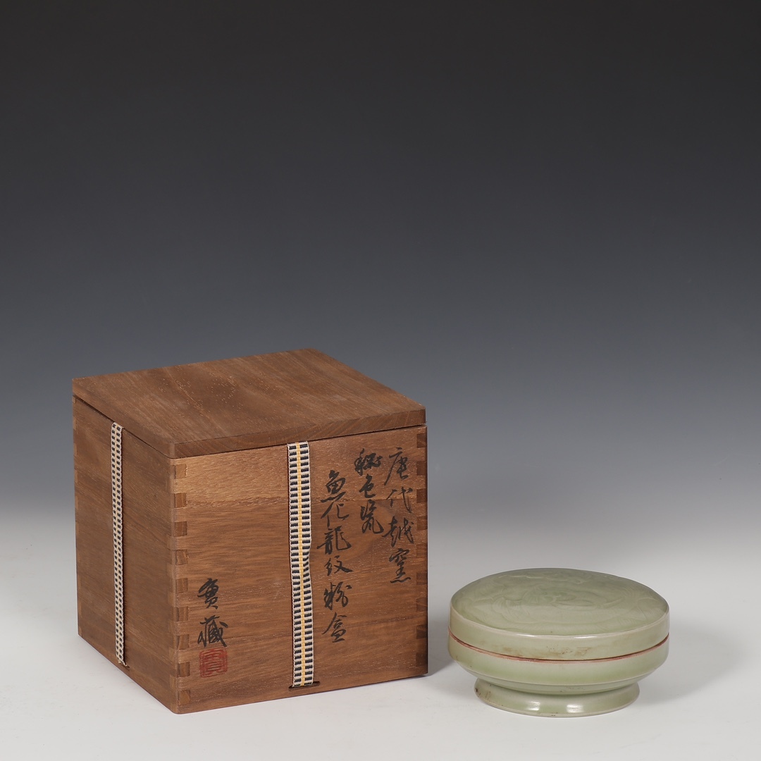 - 『唐・古陶磁器・越窯・秘色磁・魚化龍紋・粉盒・箱付』極細工・時代物・東洋彫刻・古賞物・中国古玩・中国古美術