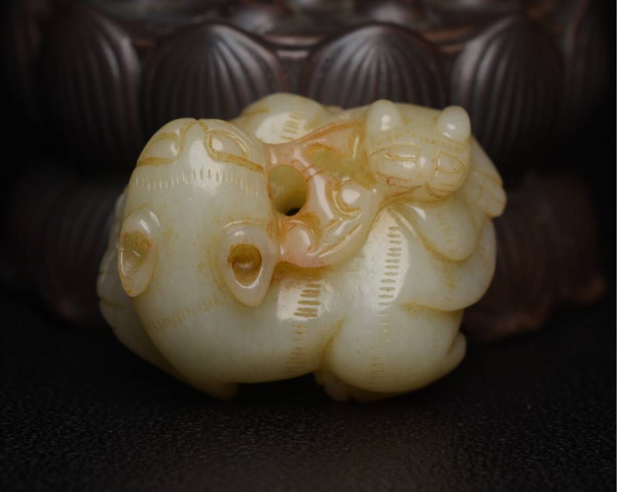 - 『清・古和田玉彫・双獣・吊墜・鏈付』極細工・骨董品・古賞物・中国古玩・中国古美術