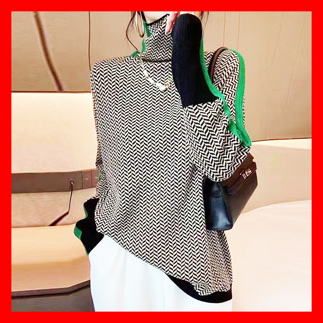 - ニットセーター長袖 ボトルネック ヘリンボーン 緑グリーン黒ブラック ハイネック