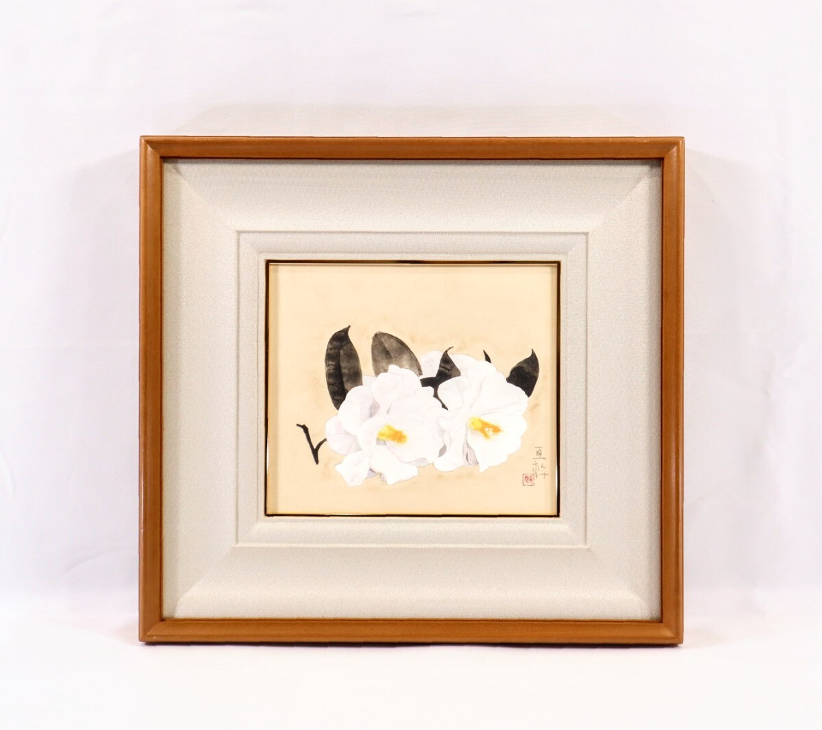 - 真作 青山亘幹 日本画「椿花」画寸 24cm×21cm 神奈川県出身 横の会所属 日本の四季を感じる花々を描く 柔らかな質感で繊細かつ優美 10421