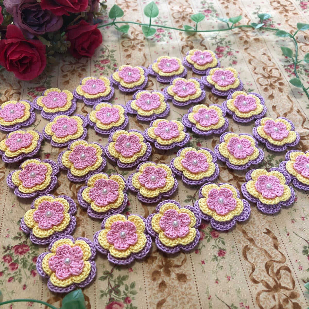 - (No.120)☆ハンドメイド☆3重お花(^^)30枚【3色】モチーフ パーツ等に 編み重ねタイプ