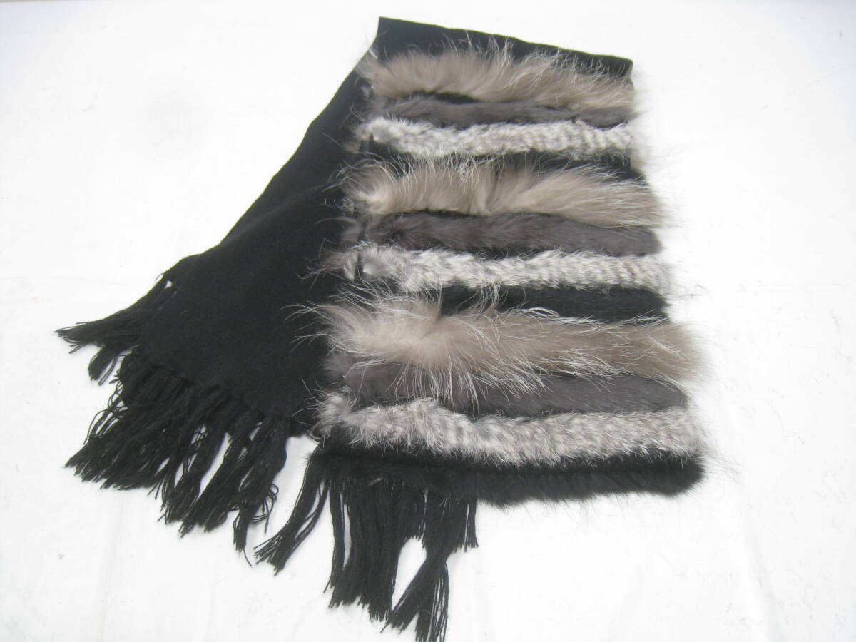 - ファー マフラー フリンジ ニット 黒×グレー ラビットファー フォックスファー