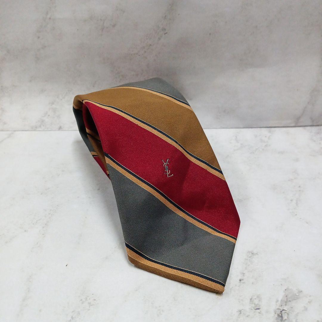 - イヴサンローラン ネクタイ 赤 灰色 黄土色 ストライプ柄 【n279】