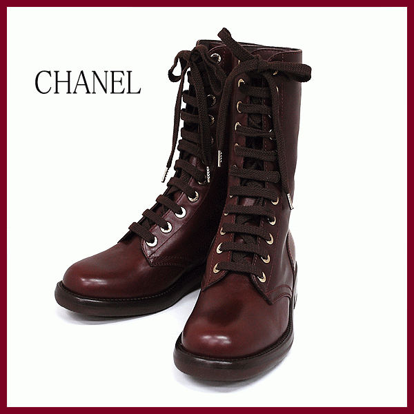 > 送料無料 本物 未使用品 CHANEL シャネル 編み上げブーツ エンジニアブーツ ボルドー レザー 35 1/2 レディース