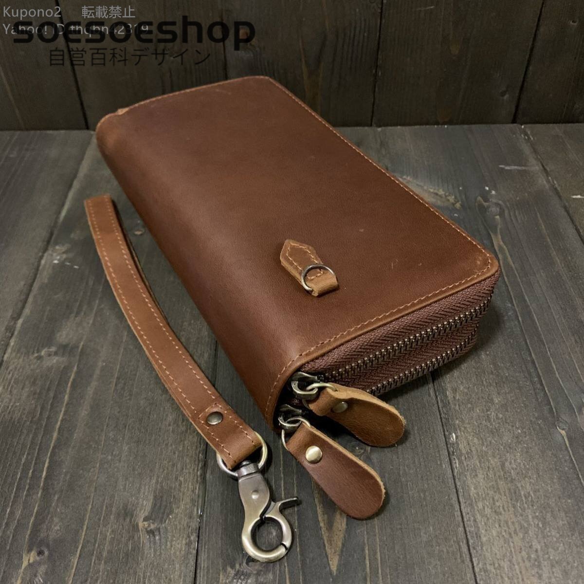 - 人気美品★クレイジーホースレザー★ダブルラウンドファスナー 財布★本革★ブラウン★長財布 イタリアンレザー オイルヌバック メンズ