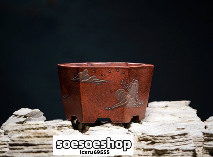 - 特価★極上品 紫砂 紫泥 盆栽鉢 植木鉢 山水風景 浮き彫り 紫泥絵 六角 手作り ハンドメイド 幅10.5cm×高さ6cm