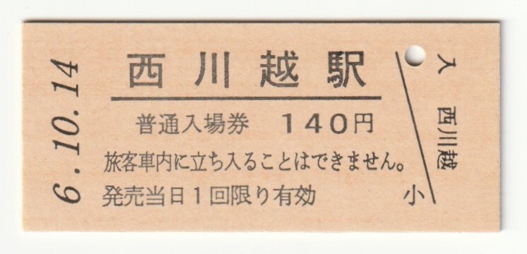 - 平成6年10月14日 川越線 西川越駅 140円硬券普通入場券(日付印刷)