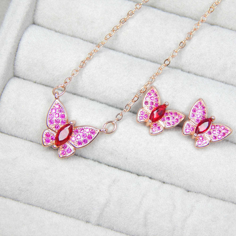 > 新品★送料無料 深紅の蝶 CZルビーダイヤモンドネックレス&ピアス レディースアクセサリー ジルコニア シルバー925 ピンクゴールド