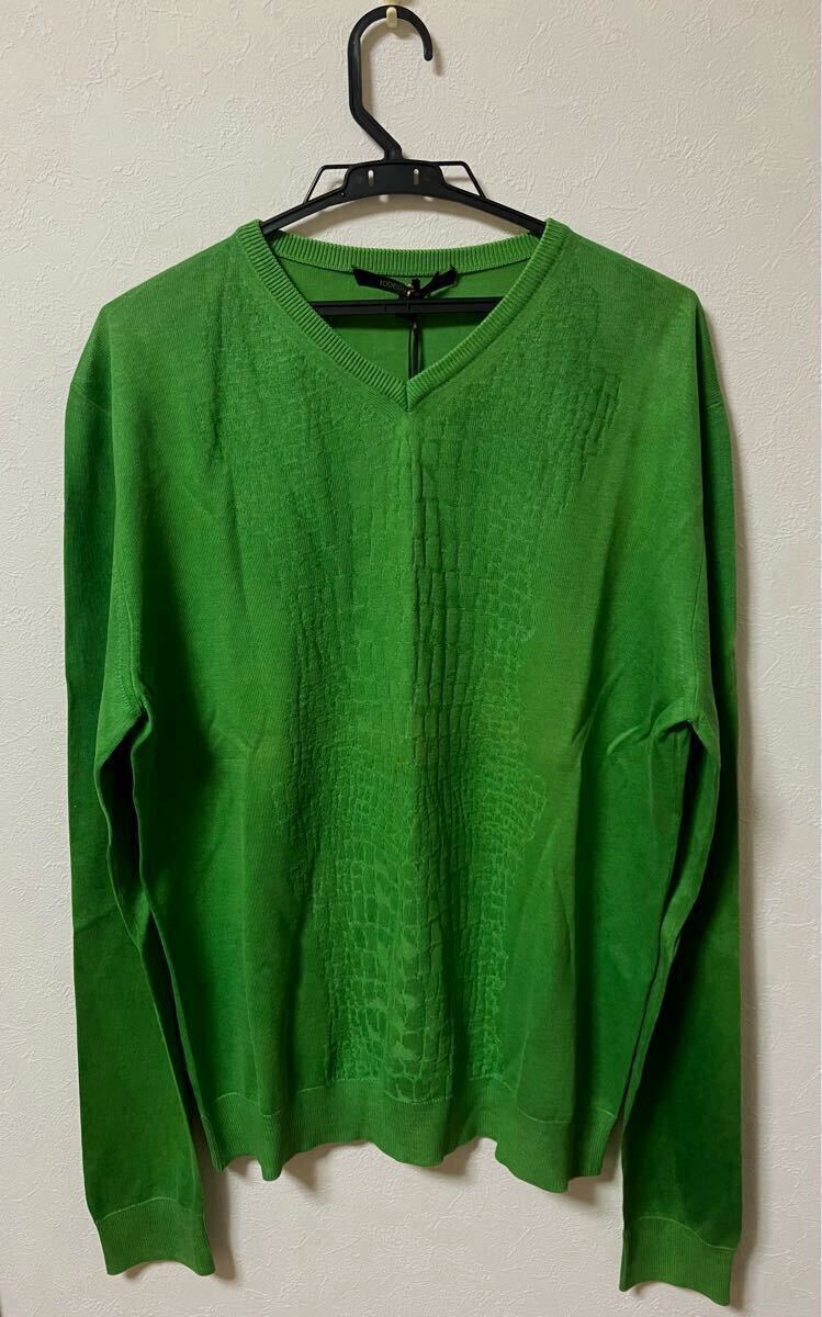 > 【新品タグ付】ロベルト カヴァリ/ROBERTO CAVALLI/薄手ニット(Lサイズ)グリーン/コットン100%/クロコ型押しデザイン