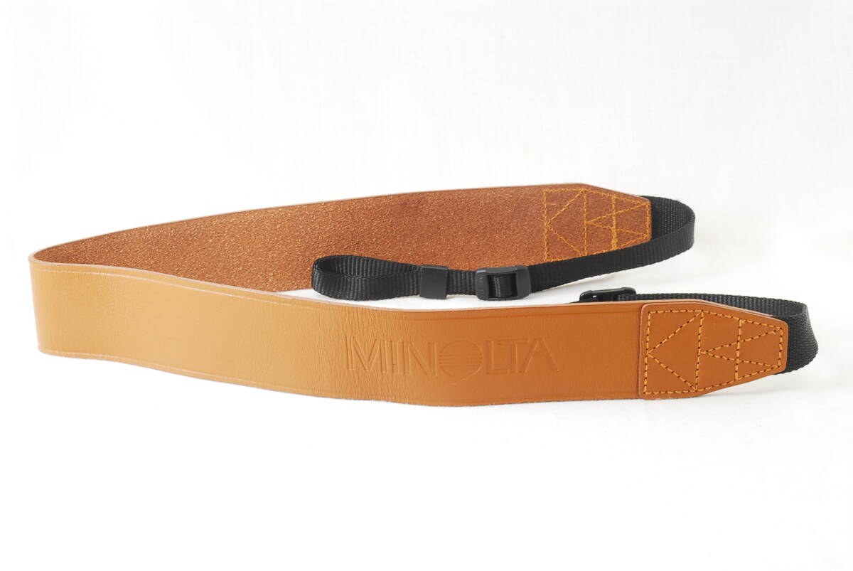 > ☆レア☆MINOLTA ミノルタ カメラ ストラップ 本革製 レザー キャメル ブラウン 茶色 型押し文字 ネック ショルダー Camera Strap☆