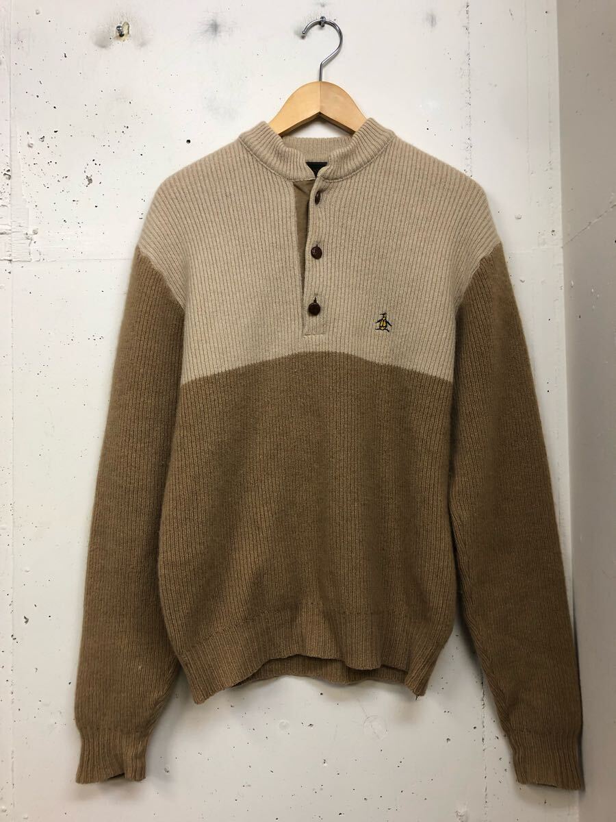 - マンシングウエア ヘンリーネック リブニット バイカラー セーター 胡桃ボタン 50%キャメル ラクダヘアー ゴルフウェア