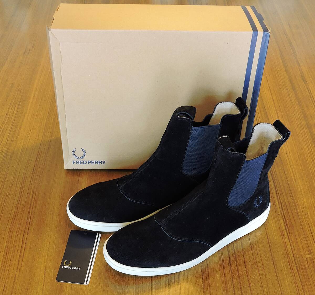 > 美品 FRED PERRY フレッドペリー バックスキン サイドゴア・ブーツ ネイビー 紳士靴 メンズ サイズ表記 EUR43 /UK7/ 約27.5cm
